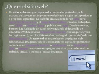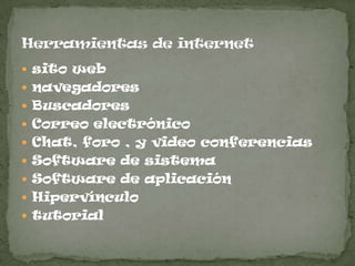 El documento habla sobre varias herramientas esenciales de Internet como sitios web, navegadores, buscadores, correo electrónico, chat, foros, videoconferencias, software libre y de sistema, software de aplicaciones, hipervínculos y tutoriales. Explica brevemente qué son cada una de estas herramientas y para qué sirven.
