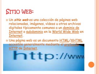 Este documento describe varias herramientas esenciales de Internet como sitios web, navegadores, buscadores, correo electrónico, chat, foros, videoconferencia, tutoriales, hipervínculos y diferentes tipos de software. Explica brevemente qué son cada una de estas herramientas y cómo funcionan. También advierte sobre los riesgos de acceder a contenido inapropiado o contactar a desconocidos a través de Internet, especialmente para los jóvenes.