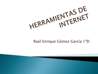 Este documento describe diferentes herramientas de Internet como sitios web, navegadores, buscadores, correo electrónico, chat, foros, videoconferencia, software libre, software de instalación, hipervínculos, links y tutoriales. Explica brevemente qué son, cómo funcionan y para qué sirven cada una de estas herramientas.
