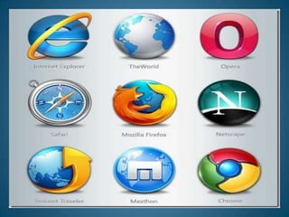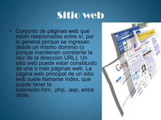 Un sitio web está compuesto de páginas web relacionadas entre sí bajo un mismo dominio. Los navegadores más populares son Internet Explorer, Firefox, Safari, Opera y Chrome. El correo electrónico permite enviar y recibir mensajes de forma rápida a través de Internet. Los buscadores como Google, Yahoo y Bing indexan páginas web y ofrecen resultados de búsqueda relacionados con palabras clave. El chat y los foros son medios de comunicación en línea para conversaciones y discusiones.