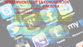 El documento describe varias herramientas de comunicación sincrónicas y asincrónicas. Entre las herramientas sincrónicas se encuentran MSN Messenger, Google Talk, Skype, Facebook, y WhatsApp. Las herramientas asincrónicas incluyen Gmail, Instagram, YouTube, Twitter y Outlook. El documento explica las características y usos de cada una de estas herramientas.