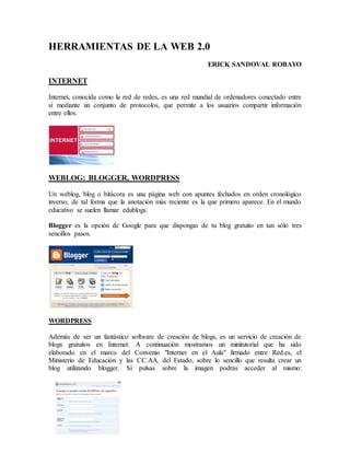 El documento describe varias herramientas web 2.0 como blogs, wikis, YouTube y Google Docs que permiten compartir información e ideas y colaborar en línea. También menciona herramientas para crear mapas mentales, cómics, presentaciones multimedia y convertir documentos sin necesidad de descargas.