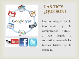Las tecnologías de la información y la comunicación (TIC's) se han convertido en una parte fundamental de la sociedad. El documento enumera algunas herramientas TIC como Internet, correo electrónico, foros, salas de chat, manejo de datos, grabadoras de audio y video y sitios web que pueden contribuir al proceso de enseñanza. También discute las ventajas de las TIC como el aumento de la producción y difusión de nuevas tecnologías y permitir el aprendizaje interactivo y la educación a distancia, aunque también