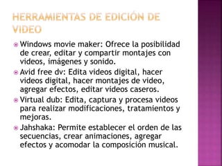Este documento presenta varias herramientas de software gratuitas para editar videos, imágenes y navegar en internet. Para videos recomienda Windows Movie Maker, Avid Free DV y VirtualDub. Para edición de imágenes sugiere Photoshop, Arcsoft Photostudio, Photoplus y GIMP. Finalmente, lista navegadores web como Mozilla Firefox, Chrome, Opera e Internet Explorer.