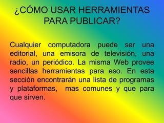 Este documento proporciona información sobre diversas herramientas de las TIC para publicar contenido en línea, incluyendo YouTube, Flickr, Facebook, Wikipedia, Twitter y SlideShare. Explica cómo usar cada plataforma, como subir y compartir videos en YouTube, y publicar fotos, presentaciones y microblogs. También cubre conceptos como aplicaciones web, correo electrónico, redes sociales e Internet.