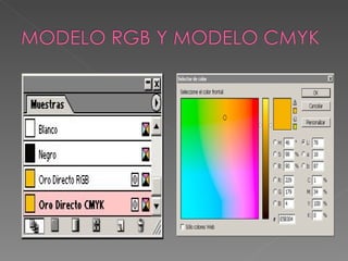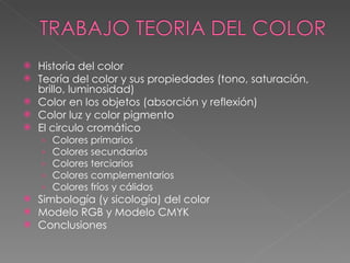 El documento resume la historia y teoría del color, incluyendo los colores primarios, secundarios y terciarios; los modelos RGB y CMYK; y la percepción del color en términos de tono, saturación y brillo. Explica que el color se origina de la absorción y reflexión de la luz y cómo los pigmentos absorben algunas longitudes de onda de luz y reflejan otras.
