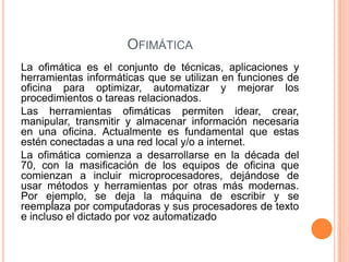 El documento describe las herramientas de ofimática más comunes como Word, Excel, Access, PowerPoint y Outlook. Explica brevemente las funciones principales de cada programa, incluyendo la creación de documentos, hojas de cálculo, bases de datos, presentaciones y el correo electrónico. También menciona algunos programas de ofimática de código abierto como Impress y Draw de OpenOffice.