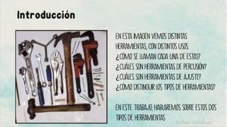 El documento detalla diversas herramientas manuales utilizadas en carpintería y construcción, describiendo su función y uso específico. Se mencionan herramientas como llaves, destornilladores, martillos de diferentes tipos, y su adecuada utilización y mantenimiento. También se aborda el uso inclusivo de estas herramientas, resaltando la participación de mujeres en oficios tradicionalmente masculinos.