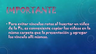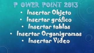 Este documento proporciona instrucciones sobre cómo insertar diferentes tipos de objetos y medios en PowerPoint. Explica cómo agregar tablas, gráficos, videos, organigramas y más. Ofrece opciones para crear estos elementos desde cero o importarlos desde archivos y sitios web. Además, brinda consejos sobre cómo personalizar y formatear los objetos insertados.