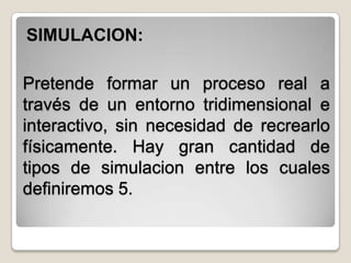 El documento describe diferentes tipos de herramientas de modelado y simulación, incluidas la simulación por computadora, la simulación médica, la simulación en la preparación y los simuladores de vuelo. Ofrece ventajas como probar sistemas sin riesgos reales, predecir resultados y flexibilidad, pero también desventajas como requerir más recursos y tiempo para desarrollar modelos.