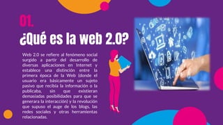 Este documento proporciona una introducción a las herramientas de la Web 2.0. Explica que la Web 2.0 se refiere al surgimiento de aplicaciones sociales en Internet que permiten una mayor interacción entre usuarios, a diferencia de la primera época de la Web. Luego enumera ejemplos de herramientas Web 2.0 como wikis, redes sociales, blogs, alojamiento de videos y podcasts, que permiten compartir y crear contenido de forma colaborativa.
