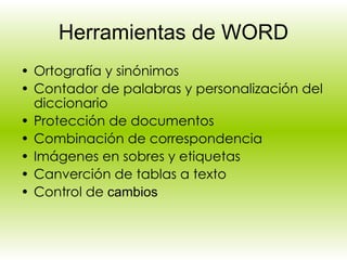 El documento resume las herramientas de Word como la ortografía y sinónimos, contador de palabras, protección de documentos, combinación de correspondencia, imágenes en sobres y etiquetas, y conversión de tablas a texto y control de cambios. Estas herramientas permiten corregir ortografía, contar palabras, personalizar el diccionario, proteger documentos importantes, crear cartas y etiquetas similares para diferentes destinatarios, agregar imágenes a sobres y etiquetas, convertir tablas a texto, y ver quién y cuándo