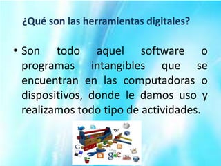Este documento describe las herramientas digitales, incluyendo que son programas intangibles que se usan en computadoras y dispositivos. Explica que tienen usos variados como comunicación, educación, investigación, documentos y entretenimiento. Además, clasifica las herramientas digitales en categorías como CMS, redes sociales, lectores RSS, marcadores sociales, edición multimedia, publicación 2.0 y más. Finalmente, señala que las herramientas digitales pueden usarse para administrar contenido, crear conocimiento e interactuar en el proceso educ