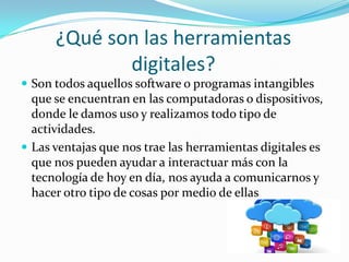 Este documento describe las herramientas digitales educativas y algunos ejemplos. Explica que las herramientas digitales son programas que se usan en computadoras y dispositivos para interactuar y comunicarse. Luego describe tres categorías de herramientas educativas digitales: generadores de cuestionarios y ejercicios, generadores de mapas conceptuales, y generadores de listas, sopas de letras y tarjetas de vocabulario. Da ejemplos concretos de aplicaciones para cada categoría.