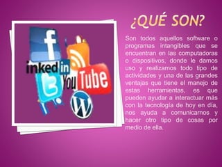 El documento describe varias herramientas digitales y sus usos. Incluye software, programas, plataformas web y aplicaciones que pueden usarse para comunicación, educación, investigación, entretenimiento y más. Algunas herramientas importantes son los sistemas de gestión de contenido, redes sociales, lectores RSS, marcadores sociales, editores multimedia y plataformas para publicar contenido.