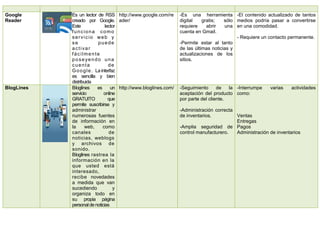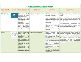 Este documento describe brevemente las características, direcciones web y ventajas y desventajas de varias herramientas digitales populares como Wordpress, Wikis, Google Reader, Bloglines, Digg, Soundation, Picassa, Bit.ly, Audacity y Flickr. Estas herramientas incluyen plataformas de publicación como Wordpress y Wikis, lectores de RSS como Google Reader, marcadores sociales como Digg, editores de audio y fotografía como Audacity y Picassa, y servicios de acortamiento de enlaces como Bit.ly.