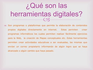 Las herramientas digitales son programas o plataformas que permiten crear contenidos educativos digitales como ejercicios para la web y mapas conceptuales. Estas herramientas permiten crear actividades para ser evaluadas y envían correos informando sobre logros alcanzados. Son importantes para la educación porque permiten a los estudiantes acceder a información que complementa los conocimientos adquiridos en la escuela.