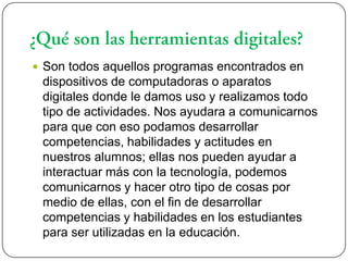 El documento describe las herramientas digitales para la educación, incluyendo programas en computadoras y dispositivos que ayudan a desarrollar habilidades en los estudiantes. Las herramientas digitales pueden usarse como objetos de aprendizaje, medios para aprender o apoyo al aprendizaje. Se necesita personal capacitado para sacar el mejor provecho de las herramientas digitales y crear ambientes de aprendizaje efectivos.