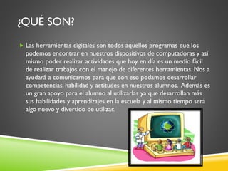 Este documento describe las herramientas digitales y su importancia para la educación. Explica que las herramientas digitales como las computadoras son útiles para realizar tareas, comunicarse y desarrollar habilidades en los estudiantes. También destaca que estas herramientas son importantes para el aprendizaje de los estudiantes y su vida futura, y menciona objetos de aprendizaje, videojuegos y software de trabajo colaborativo como ejemplos de herramientas digitales útiles para la educación.