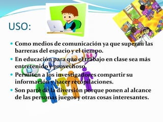 Este documento describe los usos, clasificaciones y funciones de las herramientas digitales. Las herramientas digitales se pueden usar como medios de comunicación, en educación, y para que los investigadores compartan información. Se clasifican en categorías como redes sociales, editores multimedia, y acortadores de URL. Sus funciones incluyen facilitar actividades relacionadas con tareas, mejorar la calidad de vida y comunicación entre usuarios, y permitir el uso de herramientas como Office y mensajería instantánea.