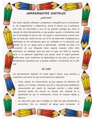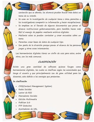 El documento describe las herramientas digitales, que son programas intangibles que se usan en computadoras y dispositivos para realizar actividades. Estas herramientas ayudan a interactuar con la tecnología, comunicarse y aprender, siempre y cuando el personal esté capacitado para sacar el mejor provecho de ellas. Las herramientas digitales se usan principalmente para comunicación, educación, investigación, documentos y entretenimiento. Existen varios tipos clasificados según su función como CMS, redes sociales, lectores RSS, marcadores sociales y más
