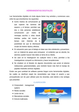 Este documento clasifica y describe varias herramientas digitales útiles para docentes. Incluye sistemas de gestión de contenido, redes sociales, lectores RSS, marcadores sociales, herramientas de edición multimedia, formas de publicar contenido en línea de forma colaborativa, servicios FTP gratuitos, acortadores de URL, almacenamiento en la nube, y transmisión en vivo. Explica brevemente los usos y ejemplos de cada categoría de herramientas digitales.