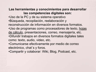 El documento describe las herramientas y habilidades necesarias para desarrollar competencias digitales, incluyendo el uso de computadoras, programas de oficina, búsqueda de información en varios formatos, comunicación electrónica y compartir trabajo digitalmente. También discute cómo las tecnologías de la información y comunicación pueden integrarse en la educación para desarrollar habilidades como buscar, procesar y comunicar información de manera autónoma y crítica.