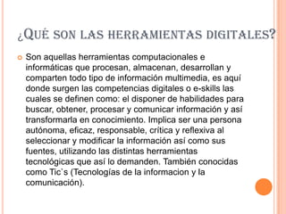 Este documento describe las herramientas digitales y competencias digitales. Define las herramientas digitales como aquellas computacionales e informáticas que procesan, almacenan, desarrollan y comparten información multimedia. Las competencias digitales son habilidades para buscar, obtener, procesar y comunicar información usando herramientas tecnológicas. El documento también explica que las herramientas y conocimientos para desarrollar competencias digitales incluyen el uso de la PC, búsqueda de información, y programas como procesadores