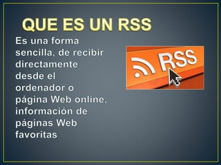 Este documento describe los lectores RSS, que permiten a los usuarios suscribirse a fuentes de noticias en línea para recibir actualizaciones de contenido sin tener que visitar cada sitio individualmente. Explica que los lectores RSS se pueden instalar directamente en el ordenador, usar lectores en línea, o integrar en el navegador web o correo electrónico. También proporciona ejemplos populares de cada tipo de lector RSS.