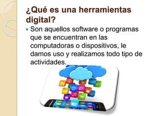 Este documento describe las herramientas digitales, sus características y usos. Explica que son software o programas que se pueden usar en computadoras o dispositivos para comunicarse, investigar, crear bases de datos y enriquecer el contenido educativo. También analiza cómo las herramientas digitales pueden utilizarse para mejorar la enseñanza y el aprendizaje en el aula y las funciones e impactos positivos que tienen en los procesos educativos.