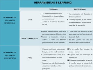 Este documento presenta una tabla comparativa de las herramientas de aprendizaje electrónico sincrónicas y asincrónicas, describiendo sus ventajas y desventajas. Entre las herramientas sincrónicas se encuentran el chat y las videoconferencias, que permiten la comunicación en tiempo real pero requieren de hardware y software avanzados. Las herramientas asincrónicas incluyen los foros, que facilitan el aprendizaje colaborativo pero carecen de comunicación en vivo. El documento analiza estas alternativas para apoyar la