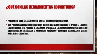 Las herramientas educativas más utilizadas a nivel mundial son Twitter, Google Drive/Docs y YouTube según la 7ma encuesta anual de herramientas de aprendizaje. Twitter se ha mantenido en el primer puesto por quinto año consecutivo mientras que Google Drive/Docs subió hasta el segundo puesto. Otras herramientas populares incluyen PowerPoint, Evernote, Google Hangouts y nuevas plataformas como Coursera.