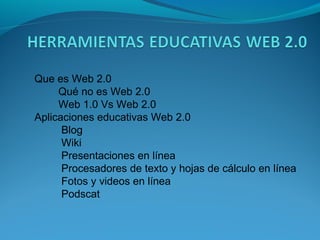 El documento habla sobre la Web 2.0 y sus aplicaciones educativas. Explica que la Web 2.0 se refiere a una segunda generación de la Web basada en comunidades de usuarios y servicios que fomentan la colaboración entre usuarios, como redes sociales, blogs, wikis y folksonomías. También compara la Web 1.0 con la Web 2.0, señalando que la Web 2.0 permite una experiencia de lectura-escritura donde los usuarios son participantes activos. Finalmente, describe aplicaciones educativas de la Web 2.