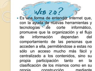 El documento describe las herramientas educativas de la Web 2.0 como blogs, wikis, etiquetado, compartir multimedia, podcasting y RSS. Explica sus ventajas para la educación como facilitar el aprendizaje colaborativo y autónomo, y las competencias digitales requeridas por estudiantes y profesores para aprovecharlas. También cubre los requisitos técnicos y las consideraciones para su uso didáctico efectivo en la escuela.