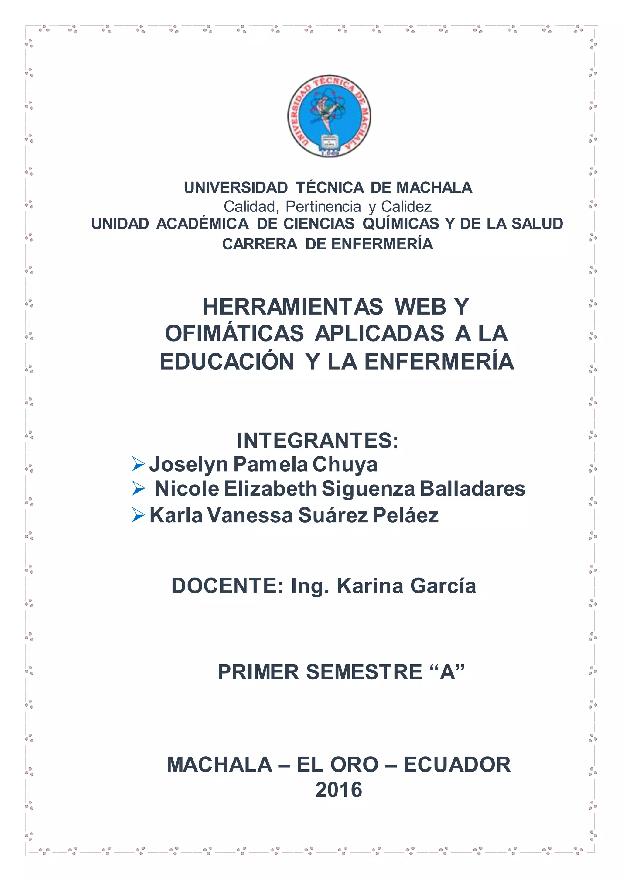 Este documento presenta varias herramientas web y ofimáticas aplicadas a la educación y la enfermería, incluyendo Microsoft Word, Excel, PowerPoint, Access, YouTube, Blogger, Facebook, Outlook, Prezi, Adobe Flash, Constructor Atenex, Mendeley e Index de Enfermería. Describe brevemente las funciones y usos de cada herramienta para propósitos educativos y de enfermería.