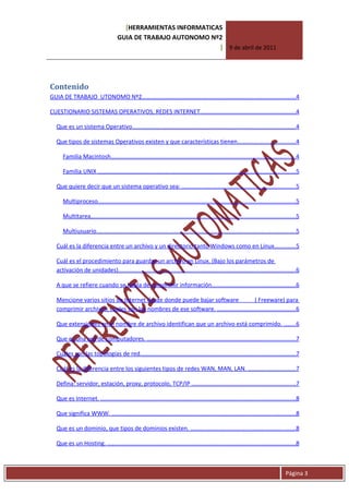 Este documento presenta una guía de trabajo autónoma sobre sistemas operativos y redes de Internet. Explica conceptos clave como qué es un sistema operativo, los tipos existentes y sus características. También define términos como multiproceso, multitarea y multiusuario. Además, describe las diferencias entre archivos y directorios, y cómo comprimir información. Por último, define una red de computadoras y sus topologías principales.