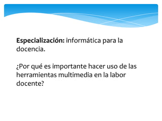 Este documento discute la importancia de usar herramientas multimedia en la enseñanza. Explica que las herramientas multimedia pueden ayudar a que los estudiantes se interesen más y aprendan de manera más emotiva. También menciona que los profesores necesitan estar actualizados con la tecnología para no retrasarse con respecto a los estudiantes. Finalmente, concluye que es importante que los docentes se mantengan al día con la tecnología e informática para poder enseñar de manera innovadora.