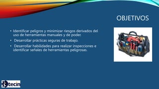 Este documento presenta lineamientos sobre el uso seguro de herramientas manuales y de poder en el trabajo. Describe los objetivos, causas comunes de accidentes, definiciones, riesgos y recomendaciones para el uso de diferentes tipos de herramientas, incluyendo herramientas manuales, eléctricas, neumáticas y de combustión interna. También enfatiza la importancia de la capacitación adecuada, el uso de equipo de protección personal, y realizar inspecciones periódicas de las herramientas.