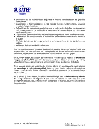 Este documento presenta una guía para realizar un análisis de riesgos por oficio (ARO) con el objetivo de identificar los factores de riesgo asociados a las tareas laborales críticas y proponer medidas para prevenir accidentes. El ARO implica enumerar los pasos de una tarea, identificar los riesgos en cada paso y recomendar controles. Realizado de forma participativa por un equipo interdisciplinario que incluya trabajadores, permite desarrollar procedimientos seguros, establecer estándares y mejorar la capacit