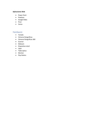 El documento define las herramientas multimedia como cualquier objeto o sistema que utiliza múltiples medios de expresión físicos o digitales electrónicas para presentar o comunicar información de manera interactiva. Luego proporciona ejemplos de software libre y con licencia, aplicaciones móviles y web, e hardware que pueden usarse como herramientas multimedia para imágenes, sonido, video y texto.