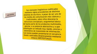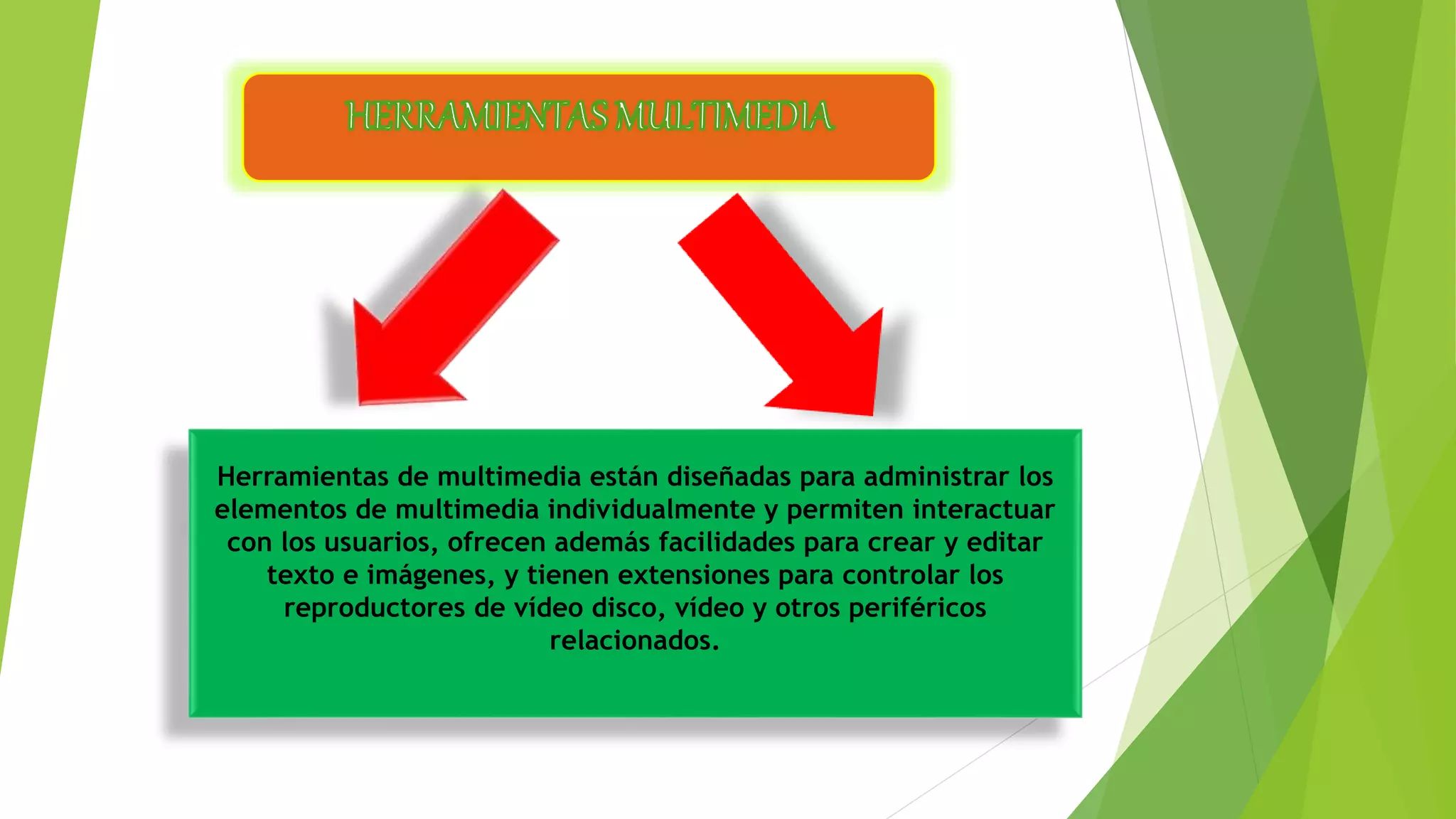 El documento describe las herramientas de multimedia y su propósito de administrar elementos multimedia individualmente y permitir la interacción con los usuarios. Estas herramientas permiten crear y editar texto e imágenes y controlar reproductores de video.