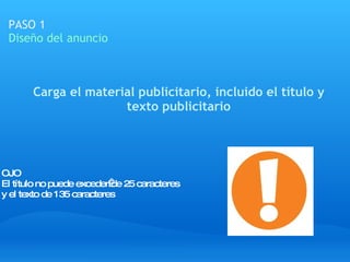 El documento proporciona un resumen de 4 pasos para publicitar en Facebook: 1) Diseñar el anuncio con título, texto y fotos; 2) Segmentar el público objetivo; 3) Establecer el presupuesto diario mínimo de $1 y decidir si pagar por clics o impresiones; 4) Repasar y publicar el anuncio introduciendo los datos de pago.