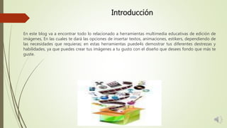 Este documento introduce varias herramientas multimedia educativas para editar imágenes, incluyendo Pizap y Befunky. Explica que las herramientas multimedia utilizan múltiples medios como fotos, videos y sonido para comunicar contenido. Pizap es conocido como uno de los editores más divertidos debido a sus efectos y opciones, mientras que Befunky permite agregar efectos, marcos y texto a imágenes para compartir en redes sociales. El documento también incluye enlaces a pruebas en línea para reforzar