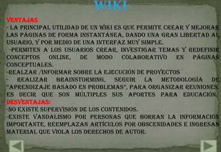BUSQUEDAS AVANSADAS ENINTERNETWIKIVentajas- La principal utilidad de un wiki es que permite crear y mejorar las páginas de forma instantánea, dando una gran libertad al usuario, y por medio de una interfaz muy simple. -permiten a los usuarios crear, investigar temas y redefinir conceptos online, de modo colaborativo en páginas conceptuales.-realzar /informar sobre la ejecución de proyectos- realizar brainstorming, seguir la metodología de “Aprendizaje basado en problemas”, para organizar reuniones. Es decir que son múltiples sus aportes para educación. Desventajas:-no existe supervisión de los contenidos.-existe vandalismo por personas que borran la información importante, reemplazan artículos por obscenidades e ingresan material que viola los derechos de autor.