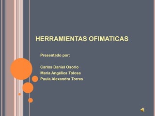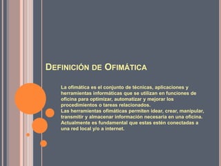 Este documento describe las principales herramientas ofimáticas como Word, Excel, Access, PowerPoint y Outlook. Word es un procesador de textos, Excel es una hoja de cálculo, Access es una base de datos, PowerPoint se usa para presentaciones y Outlook administra el correo electrónico y calendario. Las herramientas ofimáticas han facilitado la gestión de información en las oficinas y hogares de manera sencilla.