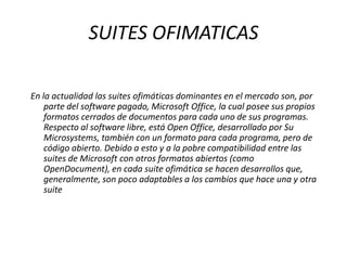 Las herramientas ofimáticas son conjuntos de programas como procesadores de texto, hojas de cálculo y bases de datos que se usan comúnmente en oficinas. Las suites ofimáticas más populares son Microsoft Office y OpenOffice, aunque usan formatos de archivo diferentes. Estas herramientas permiten crear, editar y organizar documentos, cálculos y bases de datos de manera eficiente.