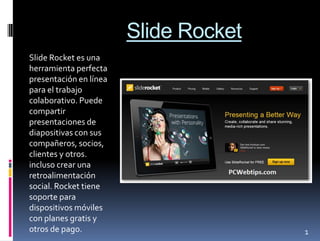 Este documento presenta 10 herramientas para crear presentaciones en línea como Slide Rocket, Knovio, Author Stream, Empressr, Prezi, Google Docs, Vcasmo, Zoho, Glogster y SlideShare. Cada una ofrece funciones como compartir presentaciones, convertir diapositivas a videos, agregar videos y audios, analizar visitas, y opciones gratuitas y de pago.