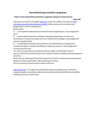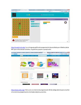 El documento discute la importancia de enseñar programación a niños y presenta varias herramientas gratuitas en línea para hacerlo. Menciona que programar desarrolla habilidades como razonamiento lógico y resolución de problemas y que los niños deben aprender a crear tecnología en lugar de solo consumirla. Luego recomienda algunos sitios populares como Code.org, Scratch, Codecademy y Greenfoot que permiten a los estudiantes aprender programación de manera interactiva y jugando.