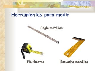 El documento lista y categoriza las diversas herramientas manuales y eléctricas utilizadas en la carpintería para medir, marcar, cortar, taladrar, tallar, desbastar, clavar, atornillar, unir y dar acabados a la madera, incluyendo reglas, escuadras, serruchos, sierras, taladros, lijadoras, martillos, destornilladores y adhesivos. Concluye que las mejores herramientas son las manos y la precaución.