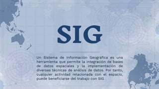 Este documento describe un sistema de información geográfica (SIG) y sus aplicaciones. Un SIG permite integrar bases de datos espaciales y realizar análisis de datos utilizando técnicas espaciales. Los SIG se usan comúnmente en cartografía, planificación, gestión de recursos, estudios de impacto ambiental y toma de decisiones. Ofrecen ventajas como la capacidad de almacenar y visualizar datos geoespaciales de manera digital, realizar análisis espaciales y tomar decisiones mejor informadas. Sin embargo, también